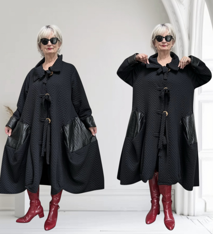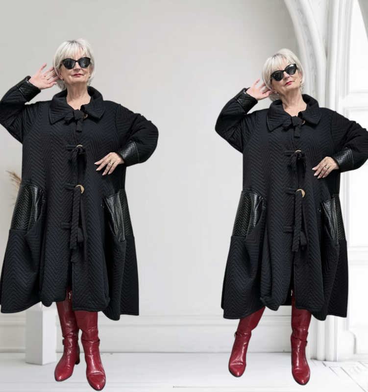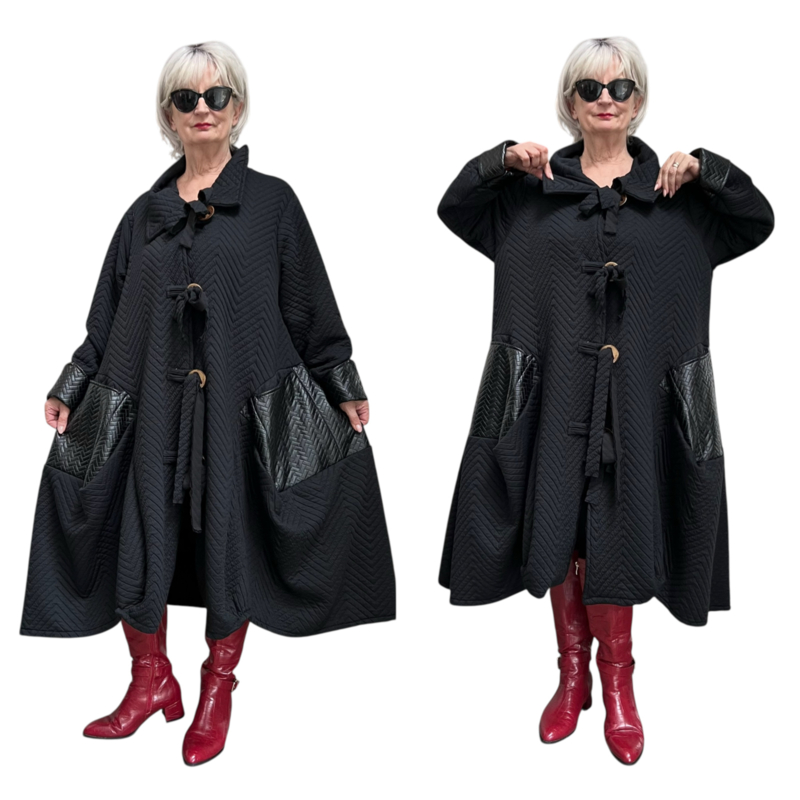 Moonshine viscose A-lijn jas met inzet van eco leder /zwart , stretch/ gevoerd/apart