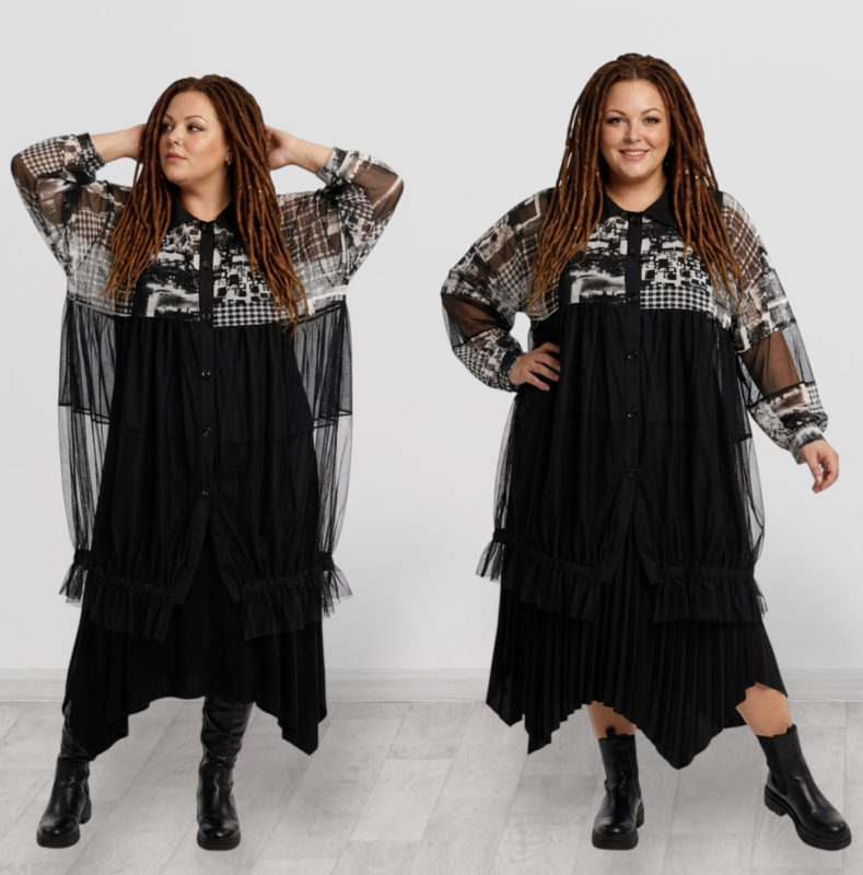 AKH blouse voor het hele jaar in een rechte snit van stretchtule. One size fits all, draagbaar tot en met maat 58, en ook populair bij klanten in kleinere maten, zowel oversized als losjes gedragen.