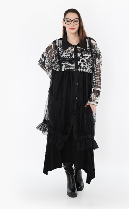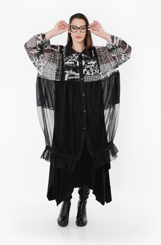 AKH oversized viscose/katoen blouse met inzet van tule apart stretch /zwart/wit