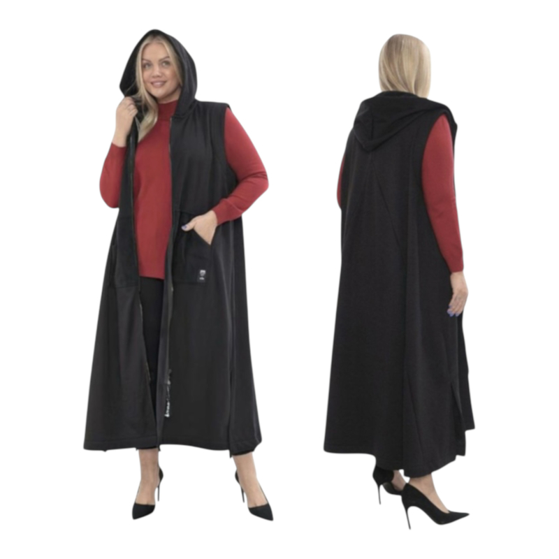 OverzichtLang vest met capuchon van Divas Planet. Mouwloos, wijde A-snit. Met doorlopende ritssluiting en opgestikte zakken aan de voorzijde.