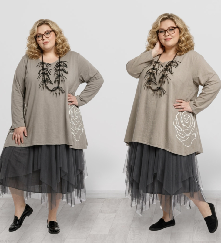 SINNE design.. A- lijn tuniek met tule en taft zwart/stretchhet ruimvallende model,